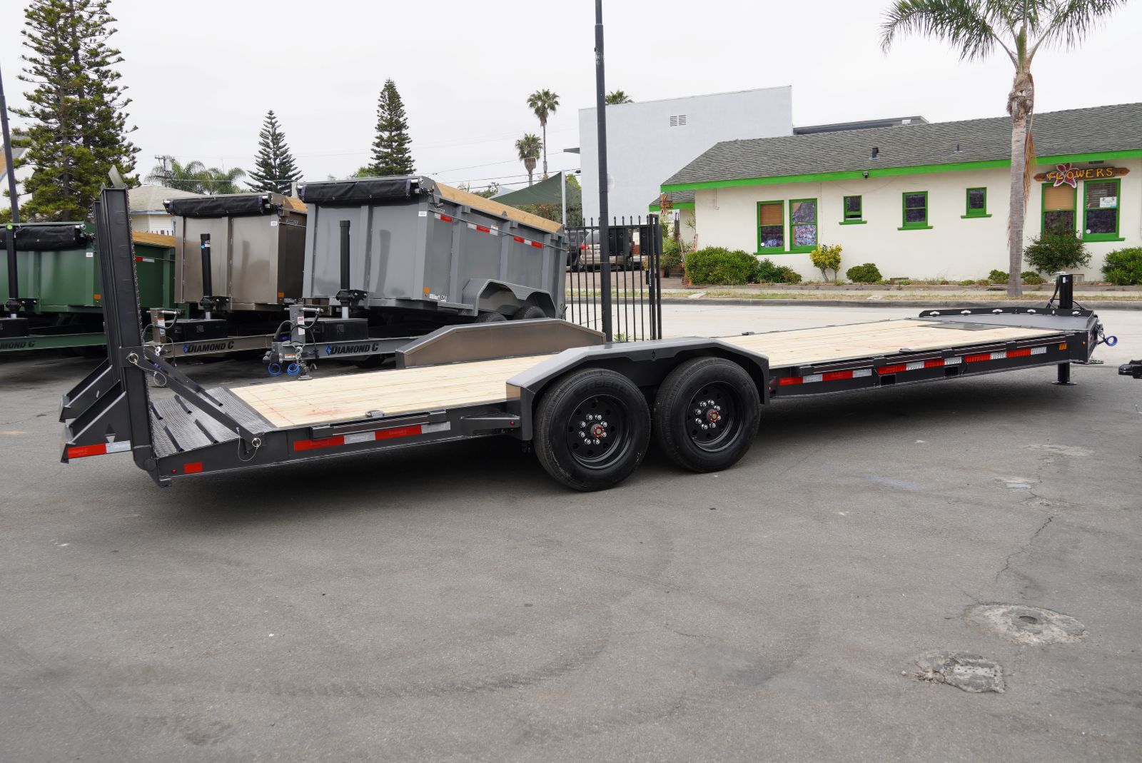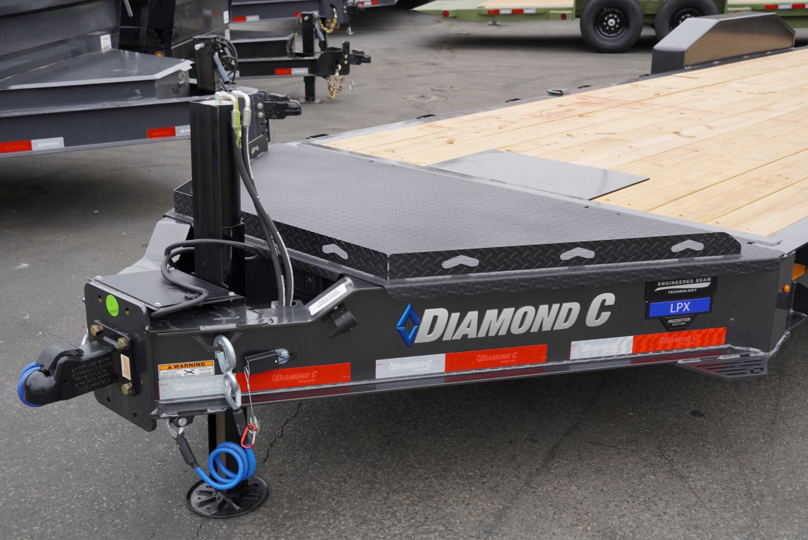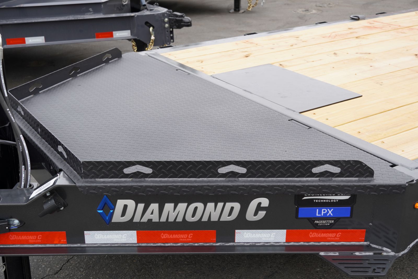 This 24' Diamond C LPX208 Pacesetter Edition trailer is built for serious hauling, combining robust construction with premium features. It boasts a durable engineered beam frame with 3" I-beam cross members on 12" centers, and a 2" treated floor. The trailer is equipped with 2-8K electric drop oil bath axles and 6-leaf slipper roller spring suspension for a smooth and stable ride.